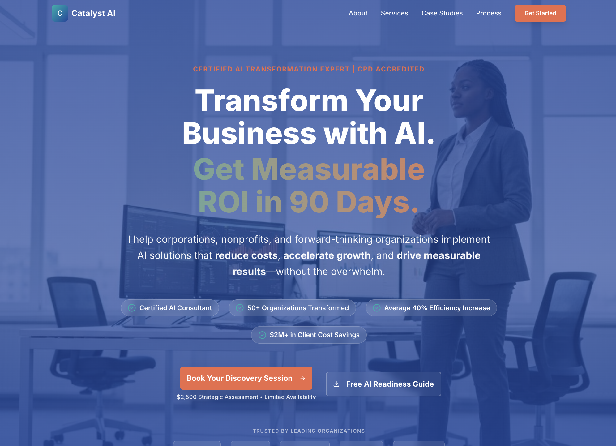 Professional consulting funnel for B2B services. Clear value proposition, credibility-building credentials section, and strategic CTAs that guide visitors from awareness to consultation booking. Designed for high-ticket service businesses.