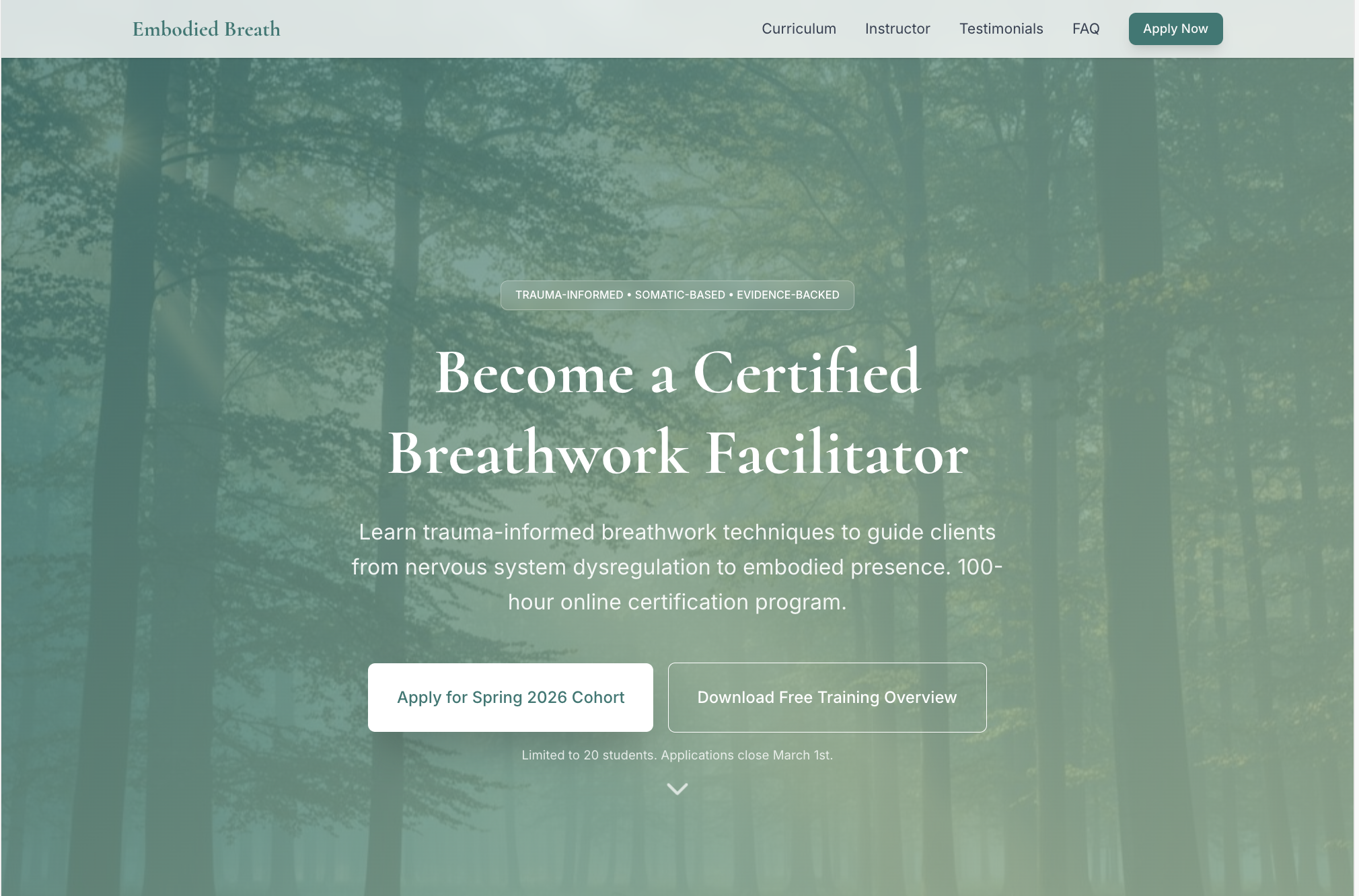 Premium certification enrollment funnel for trauma-informed breathwork training. Sophisticated design that balances evidence-based credibility with sacred, somatic aesthetics. Application-based enrollment for high-ticket course ($1,497).