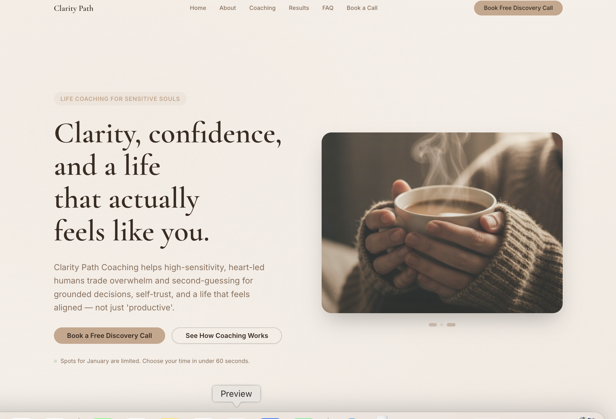 Warm, grounded design for high-sensitivity, heart-led life coaches. Soft neutrals, intuitive flow, and a booking system that makes it easy for aligned clients to say yes.