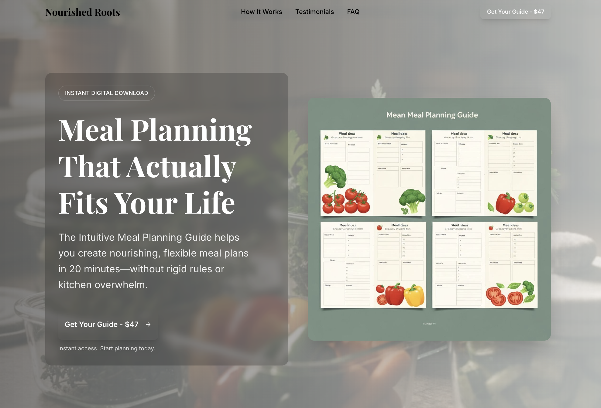 Warm, sophisticated sales funnel for a $47 digital wellness product. Clean product visualization, strategic problem/solution flow, and testimonials that build trust. Designed for immediate purchase with instant download.