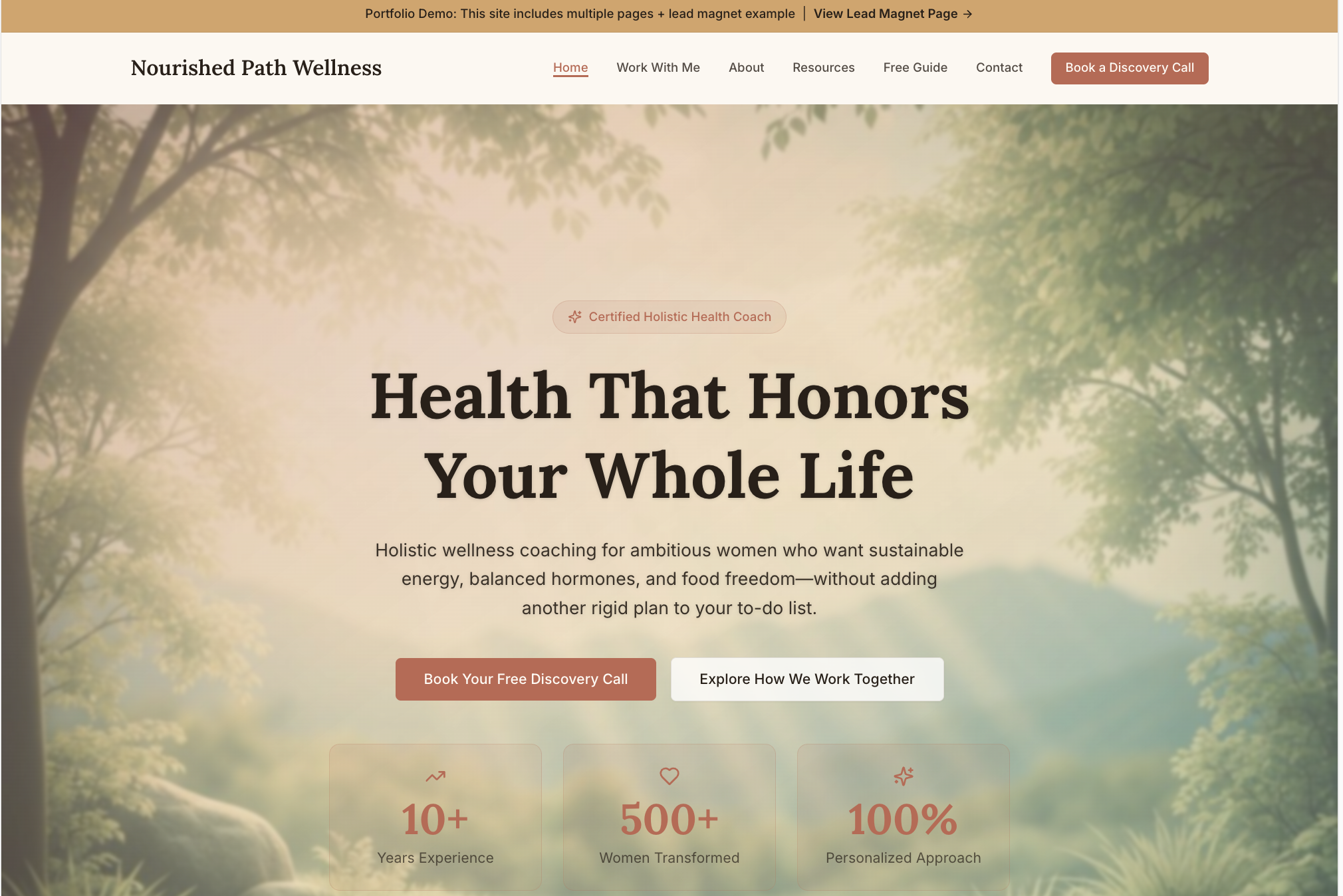 Multi-page website for a holistic health coach offering multiple service tiers. Warm, earthy aesthetic with professional navigation, services pages, about section, blog/resources hub, and integrated lead magnet page. Demonstrates complete client journey from discovery to booking.