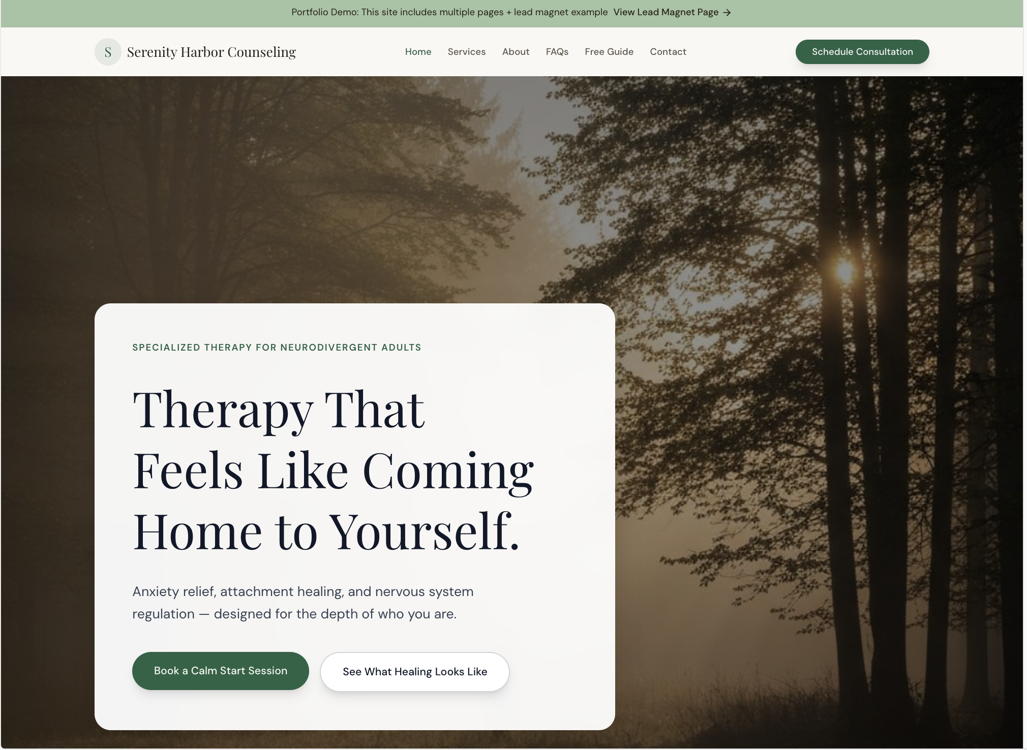Multi-page website for a trauma-informed therapy practice. Calm, trust-building aesthetic with professional navigation, multiple service offerings (individual therapy, EMDR intensives, nervous system coaching), comprehensive FAQs, and integrated lead magnet. Demonstrates HIPAA-aware design and clinical credibility.